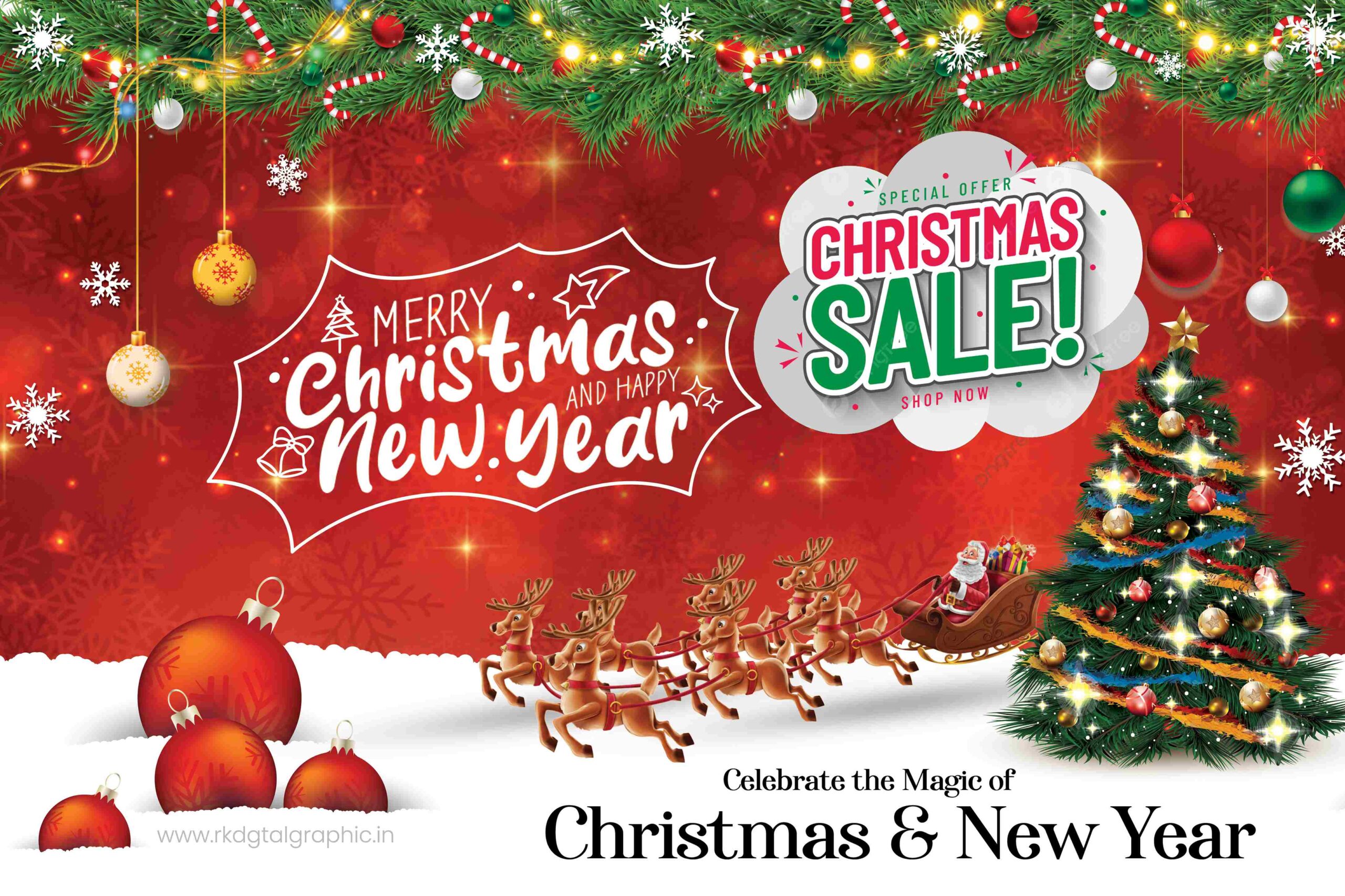 Celebrate the festive season with this Editable Christmas Flex Banner PSD Template 6×4, designed for professional Christmas and New Year promotions. This festive PSD template features a rich red holiday background with classic Christmas elements such as Santa Claus with reindeer sleigh, decorated Christmas tree, ornaments, snowflakes, lighting effects, and a bold Christmas sale message.
