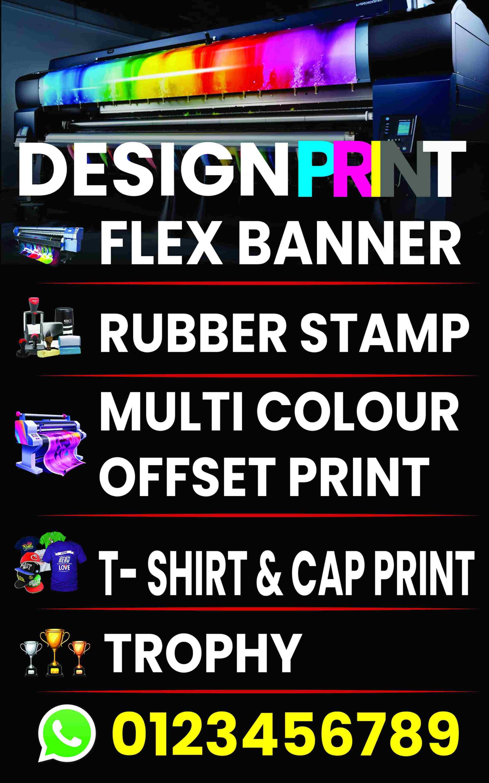 Multi-Service Showcase: Highlights important services such as flex banner printing, rubber stamps, offset multi-color printing, custom t-shirt & cap printing, and trophy supply.