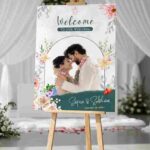 Designed in a classic 3×2 ratio, this printable wedding welcome board beautifully balances floral décor with a central photo layout, making it ideal for couples who want to showcase their wedding or pre-wedding photograph in a tasteful way.