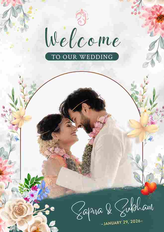This wedding welcome sign features soft green and pink florals arranged delicately around the layout, creating a calm and romantic aesthetic. The arch-style photo frame draws attention to the couple while maintaining harmony with the surrounding floral elements. The calligraphy typography adds a premium wedding feel that works well for Indian, fusion, and modern weddings.