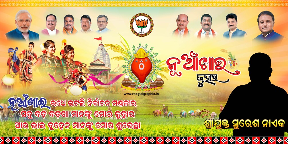 Theme: Nuakhai harvest celebration with cultural elements, political leaders, and festive Odisha traditions